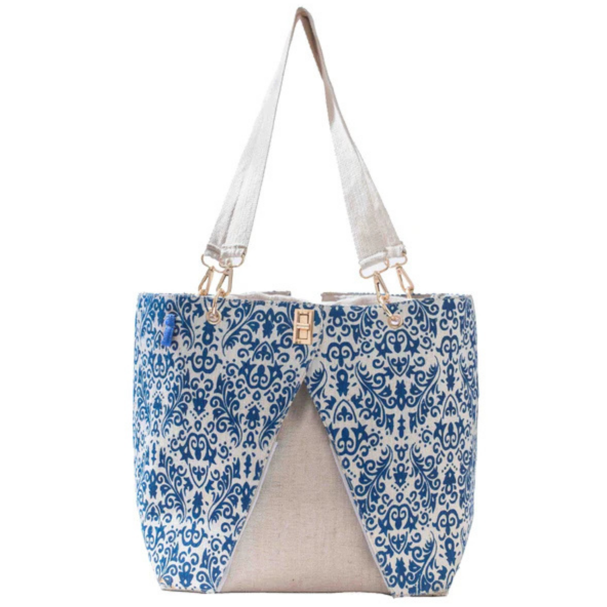Crafted with a durable natural jute exterior, the wings are lined with smooth beige taffeta for added flexibility and a soft touch. This tote includes two detachable royal blue taffeta stash bags, offering convenient storage for your yoga mat and other essentials. With its natural cotton strap, this tote offers effortless carrying and seamlessly combines comfort, style, and practicality for everyday use.